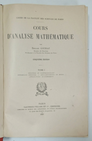 COURS D ' ANALYSE MATHEMATIQUE par EDOUARD GOURSAT , VOLUMELE I - II , 1927