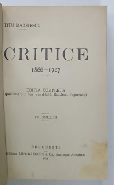 CRITICE , 1866 -1907 de TITU MAIORESCU , VOLUMELE I si III , COLEGAT , 1915-1928