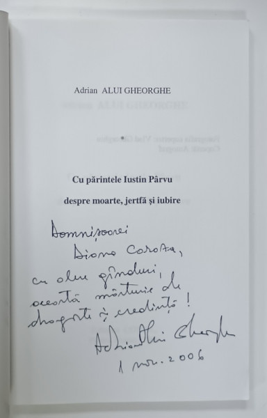 CU PARINTELE IUSTIN PARVU DESPRE MOARTE , JERTFA SI IUBIRE de ADRIAN ALUI GHEORGHE , 2006 , DEDICATIE *