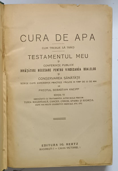 CURA DE APA - CUM SA TRAITI - TESTAMENTUL MEU SI CONFERINTE PUBLICE de PREOTUL SEBASTIAN KNEIPP - BUCURESTI