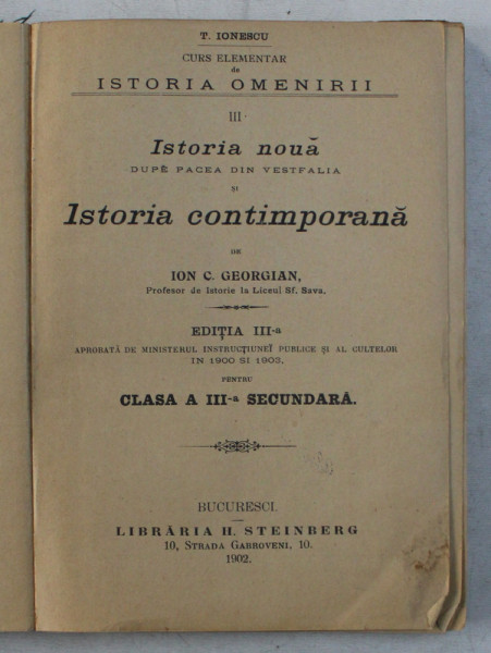 LIBRARIA H. STEINBERG , BUCURESTI , 159 PAG. , COPERTE CARTONATE , COTORUL INTARIT CU BANDA IZOLANTA , DIN COPERTA FATA LIPSESTE UN COLT