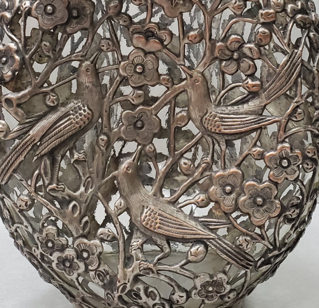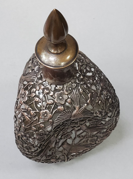 Decantor din sticla cu montura argintata, decorat cu motive florale si avimorfe.