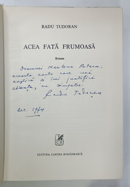 DEDICATIA LUI RADU TUDORAN PE VOLUMUL SAU ' ACEA FATA FRUMOASA ' , 1975