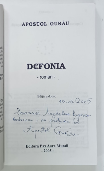 DEFONIA , ESTNOBILII , roman de APOSTOL GURAU , 2005, DEDICATIE *