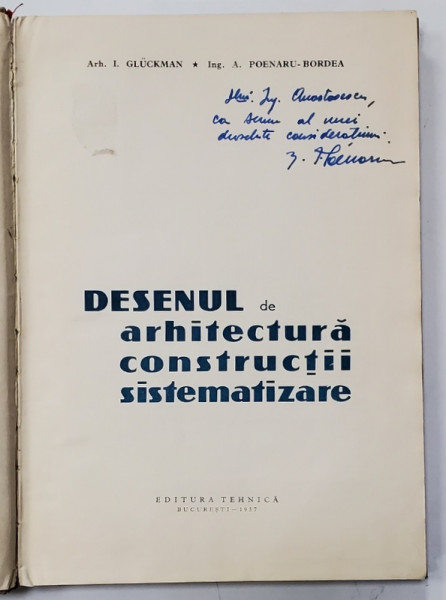 DESENUL DE ARHITECTURA , CONSTRUCTII , SISTEMATIZARE de I. GLUCKMAN si A . POENARU BORDEA , 1957 , DEDICATIE *