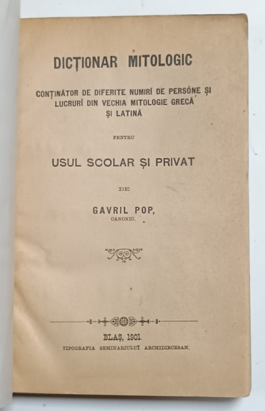 DICTIONAR MITOLOGIC ..PENTRU USUL SCOLAR SI PRIVAT de GAVRIL POP , 1901