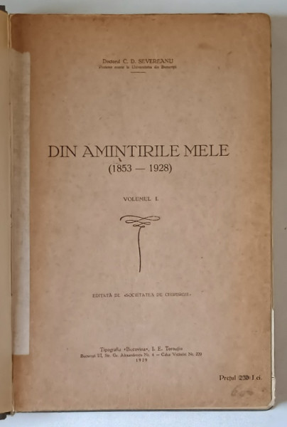 DIN AMINTIRILE MELE de DOCTORUL C.D. SEVEREANU , VOLUMELE I - II , 1853-1929 , APARUTE 1929 -1930