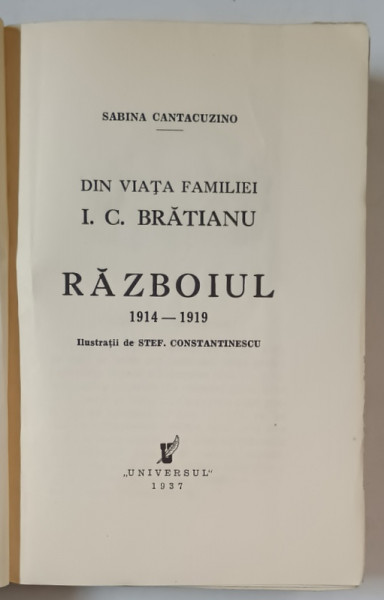DIN VIATA FAMILIEI I.C. BRATIANU RAZBOIUL 1914 -1919 de SABINA CANTACUZINO ,1937 ,contine ilustratii de STEFAN CONSTANTINESCU