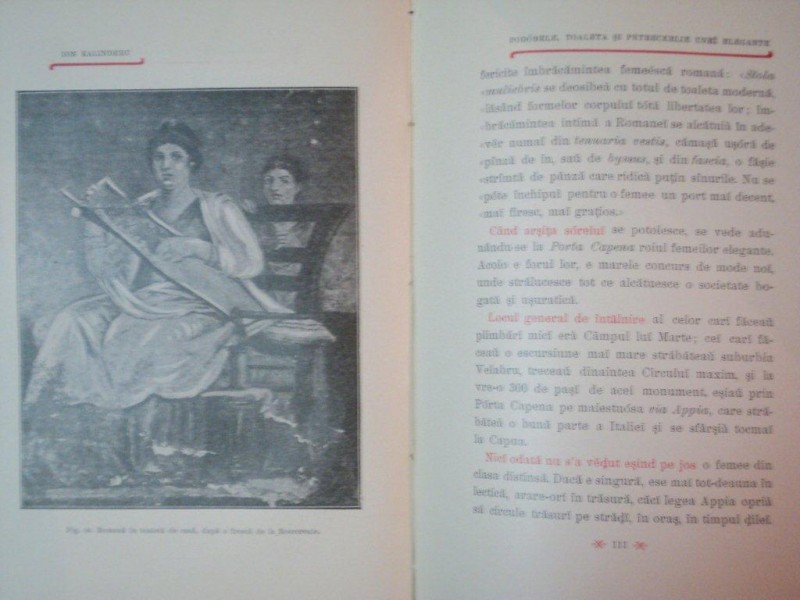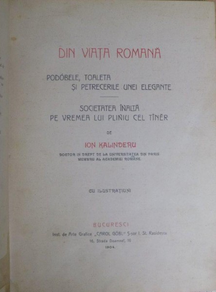 DIN VIATA ROMANA , PODOBELE , TOALETA SI PETRECERILE UNEI ELEGANTE , SOCIETATEA INALTA PE VREMEA LUI PLINIU CEL TANER de ION KALINDERU , Bucuresci 1904