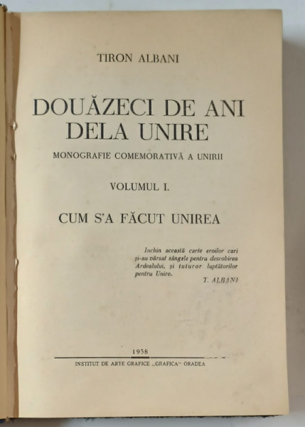 DOUAZECI DE ANI DELA UNIRE , MONOGRAFIE de TIRON ALBANI , VOLUMUL I : CUM S-A FACUT UNIREA , 1938 , EXEMPLAR NR. 359 DIN 1000 , SEMNAT *