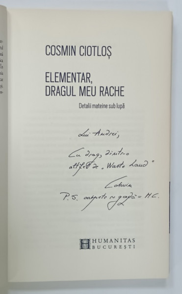 ELEMENTAR , DRAGUL MEU RACHE , DETALII MATEINE SUB LUPA de COSMIN CIOTLOS , 2017 , DEDICATIE *