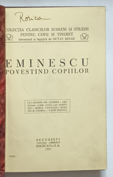 Volum din colecţia Clasicilor Rom&acirc,ni şi Străini pantru Copii şi Tineret - &Icirc,ntemeiată şi &icirc,ngrijită de Octav Minar.
