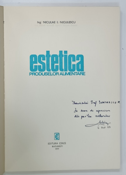 ESTETICA PRODUSELOR ALIMENTARE de NICULAE I. NICULESCU , 1977 , DEDICATIE *