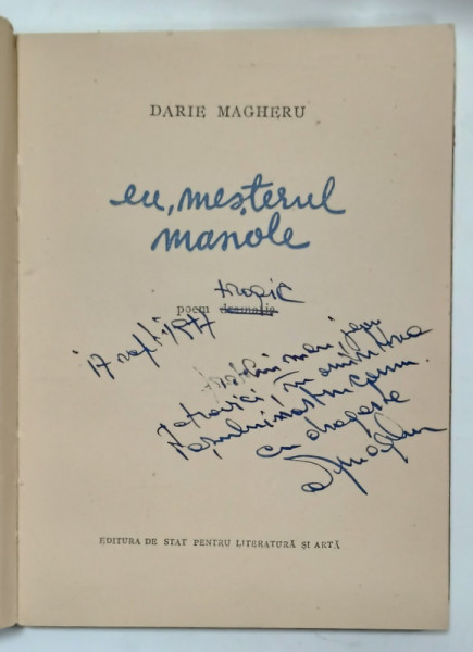 EU , MESTERUL MANOLE POEM TRAGIC de DARIE MAGHERU , 1957 , DEDICATIE , PREZINTA PETE SI URME DE UZURA
