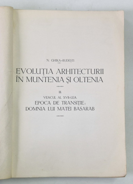 EVOLUTIA ARHITECTURII IN OLTENIA SI MUNTENIA, VEACUL AL -XVII -LEA de N.GHIKA BUDESTI VOL.III ,1933 , COTOR RESTAURAT