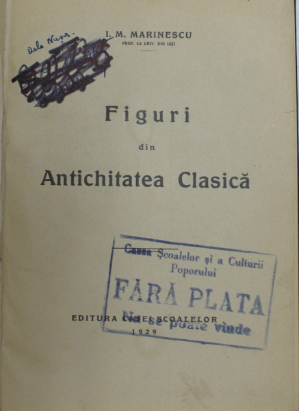 FIGURI DIN ANTICHITATEA CLASICA de I.M.MARINESCU , 1929 , PREZINTA UN DESEN CU MARKERUL PE PAGINA DE TITLU *
