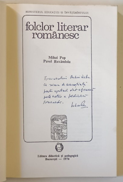 FOLCLOR LITERAR ROMANESC de MIHAI POP si PAVEL RUXANDOIU , 1976 *DEDICATIE