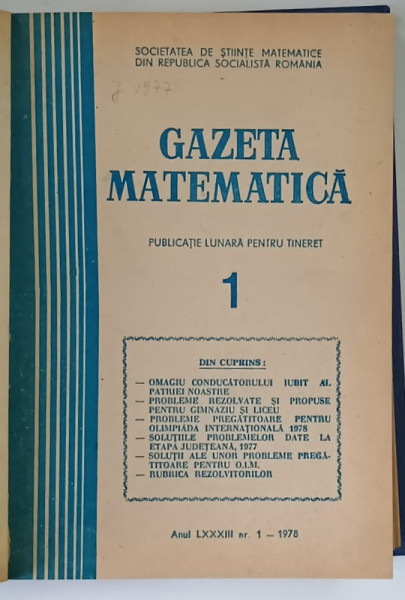 GAZETA MATEMATICA , PUBLICATIE LUNARA PENTRU TINERET , ANUL LXXXIII , NUMERELE I - XII , 1978