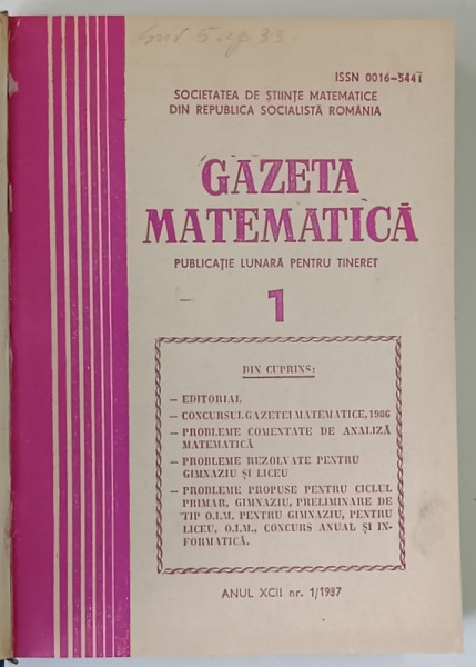 GAZETA MATEMATICA , PUBLICATIE LUNARA PENTRU TINERET , ANUL XCII , NUMERELE I - XII , 1987