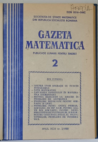 GAZETA MATEMATICA , PUBLICATIE LUNARA PENTRU TINERET , ANUL XCIII , NUMERELE I - XII , 1988 *LIPSA NUMERELE 1 , 7 , 8 , 9 , 10 , 11 , 12