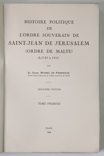 HISTOIRE POLITIQUE DE L ' ORDRE SOUVERAIN DE SAINT -JEAN DE JERUSALEM ( ORDRE DE MALTE ) DE 1789 A 1955 , TOME PREMIER par MICHEL DE PIERREDON , 1956