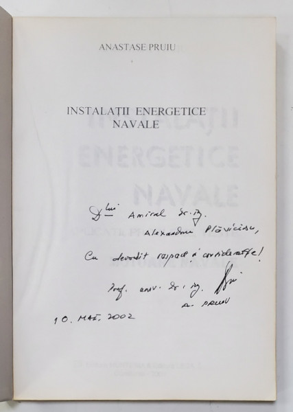 INSTALATII ENERGETICE NAVALE de ANASTASE PRUIU , 2000, DEDICATIE *
