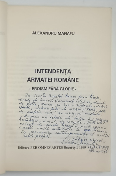 INTENDENTA ARMATEI ROMANE , EROISM FARA GLORIE de ALEXANDRU MANAFU , 1999 , DEDICATIE *