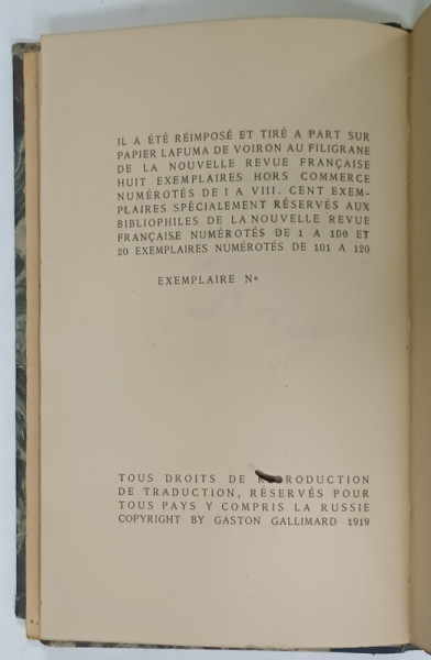 EDITIONS GALLIMARD , 100 PAGINI , STARE DE CONSERVARE CONFORM FOTOGRAFIEI , LEGATURA DE EPOCA , COTOR PIELE