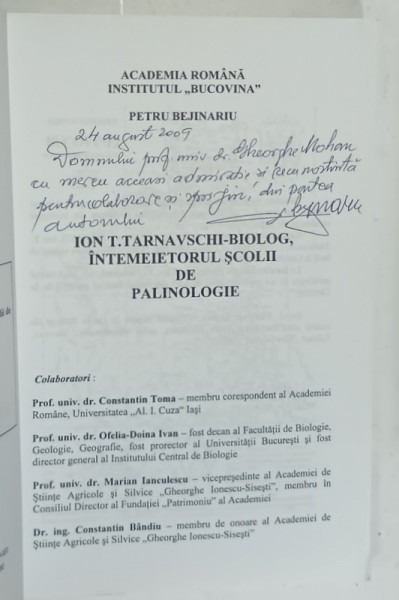 ION T. TARNAVSCHI - BIOLOG , INTEMEIETORUL SCOLII DE PALINOLOGIE de PETRU BEJENARIU , 2009