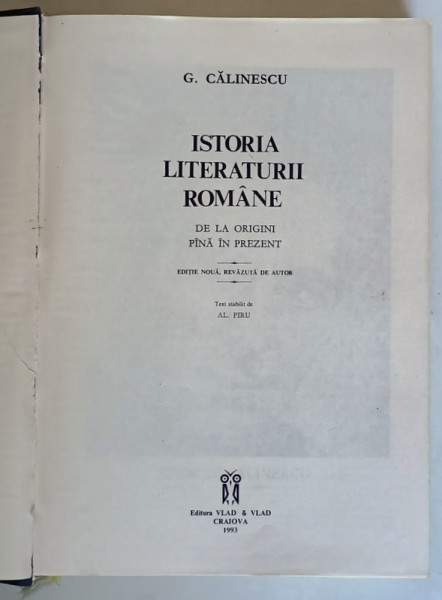 ISTORIA LITERATURII ROMANE DE LA ORIGINI PANA IN PREZENT , EDITIE NOUA , REVAZUTA DE AUTOR de GERORGE CALINESCU , 1993