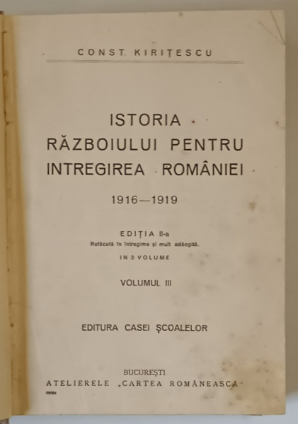 ISTORIA RAZBOIULUI PENTRU INTREGIREA ROMANIEI , 1916 - 1919 , VOLUMELE I - III , EDITIA A II - A , REFACUTA IN INTREGIME SI MULT ADAUGITA de CONSTANTIN KIRITESCU , 1925 *LIPSA PAGINA DE TITLU VOLUMELE I - II
