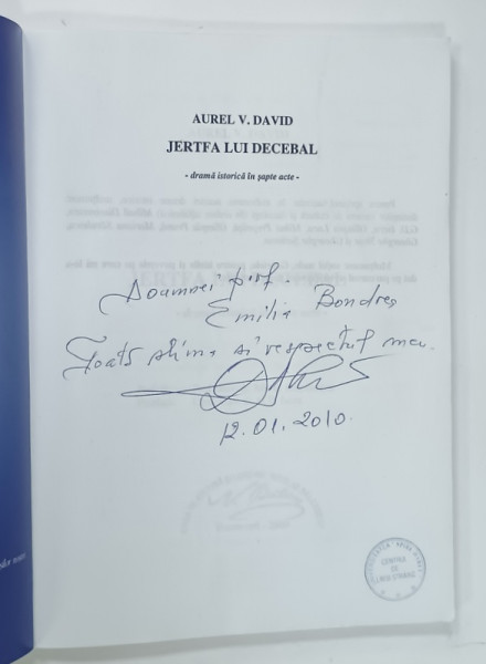 JERTFA LUI DECEBAL - DRAMA ISTORICA IN 7 ACTE de AUREL V. DAVID , 2009 , DEDICATIE *