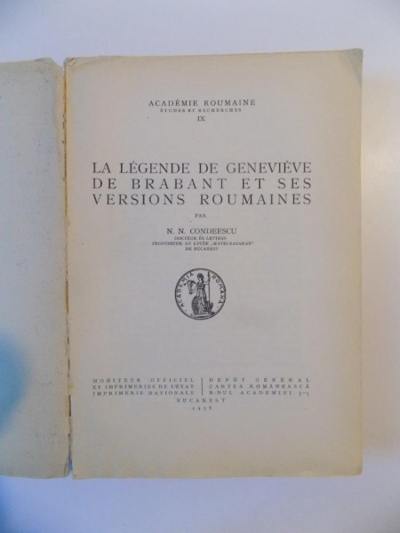 LA LEGENDE DE GENEVIEVE DE BRABANT ET SES VERSIONS ROUMAINES PAR N. N. CONDEESCU , BUCURESTI 1938