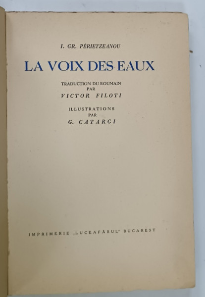 LA VOIX DES EAUX par I. GR. PERIETZEANOU , illustrations par G. CATARGI , EDITIE INTERBELICA , EXEMPLAR NUMEROTAT , CONTINE DEDICATIA AUTORULUI *