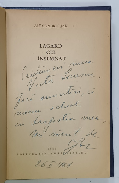 LAGARD CEL INSEMNAT de ALEXANDRU JAR , 1966 , DEDICATIE *