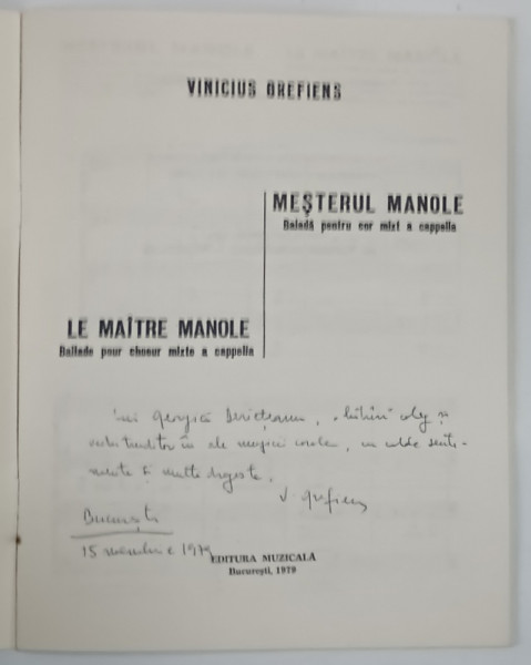 MESTERUL MANOLE , BALADA PENTRU COR MIX A CAPELLA de VINICIUS GREFIENS , 1979 *DEDICATIE