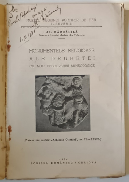 MONUMENTELE RELIGIOASE ALE DRUBETEI CU NOUI DESCOPERIRI ARHEOLOGICE de AL. BARACILA , 1934 , COPERTA CU PETE SI URME DE UZURA , DEDICATIE *