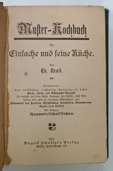 MUSTER - KOCHBUCH ( CARTE DE BUCATARIE PENTRU INCEPATOARE ) , TEXT IN LIMBA GERMANA CU CARACTERE GOTICE , von CH. KRAFT , 1893
