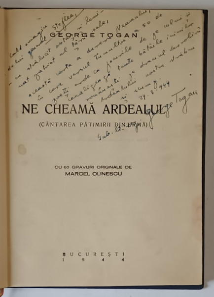NE CHEAMA ARDEALUL , CANTAREA PATIMIRII DIN URMA , cu 60 de gravuri originale de MARCEL OLINESCU , de GEORGE TOGAN , 1944 *DEDICATIE