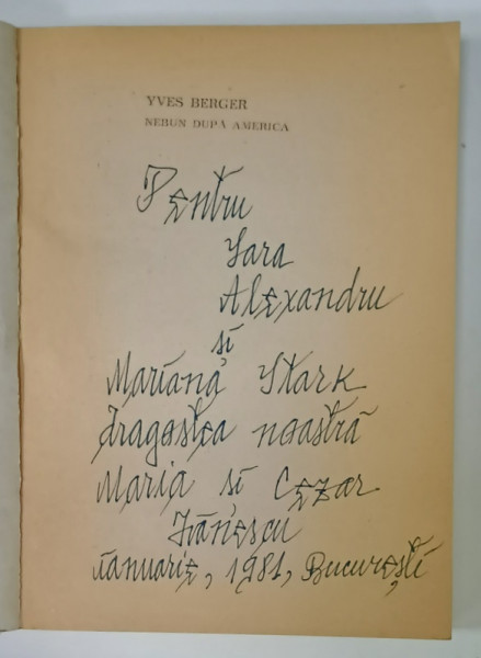 NEBUN DUPA AMERICA de YVES BERGER , traducere de MARIA IVANESCU , 1980 , DEDICATIA MARIEI si a lui CEZAR IVANESCU *