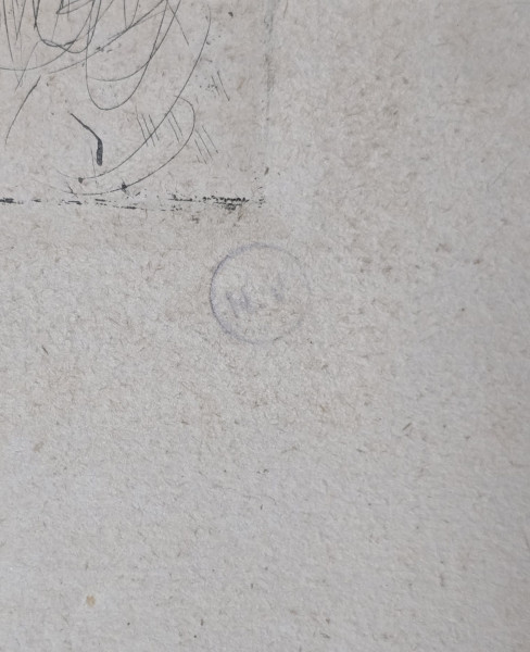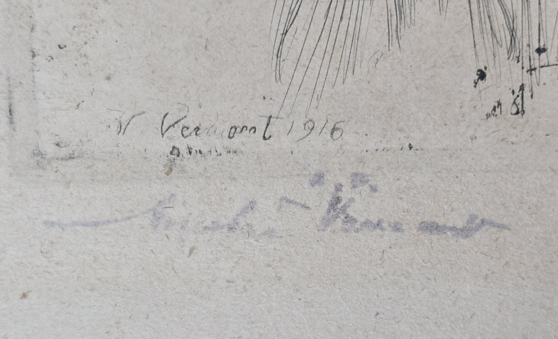Semnat stanga jos in placa si sub cadru, datat "1916" si cu monograma artistului, dreapta jos.