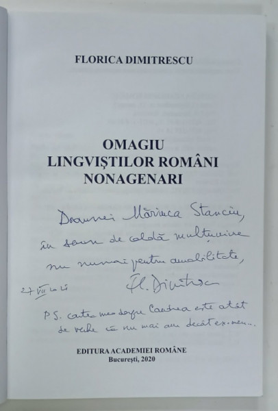 OMAGIU LINGVISTILOR ROMANI NONAGENARI de FLORICA DUMITRESCU , 2020 , DEDICATIE *