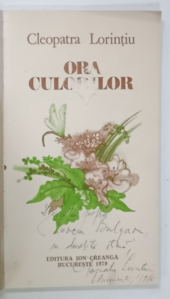 ORA CULORILOR de CLEOPATRA LORINTIU , ilustratii si coperta de ELENA BOARIU , 1979 . PREZINTA INSEMNARI , DEDICATIE *