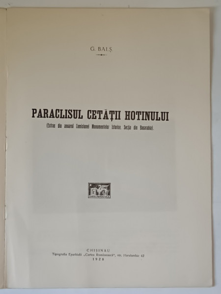 PARACLISUL CETATII HOTINULUI ( EXTRAS DIN ANUARUL COMISIUNEI MONUMENTELOR ISTORICE , SECTIA DIN BASARABIA ) de G. BALS , 1928
