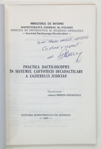 PRACTICA DACTILOSCOPIEI IN SISTEMUL CARTOTECII DECADACTILARE A CAZIERULUI JUDICIAR de AUREL OLARU ,coordonator COLONEL ERHAN SEBASTIAN , 1997 , DEDICATIE *