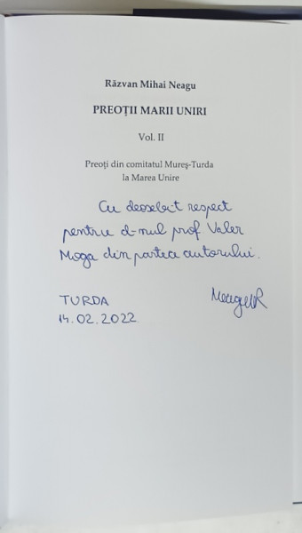 PREOTII MARII UNIRI , VOLUMUL II , PREOTI DIN COMITATUL MURES - TURDA LA MAREA UNIRE de RAZVAN MIHAI NEAGU , 2021 *DEDICATIE