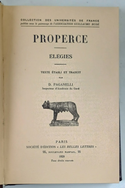 PROPERCE , ELEGIES , texte etabli et traduit par D. PAGANELLI , 1929