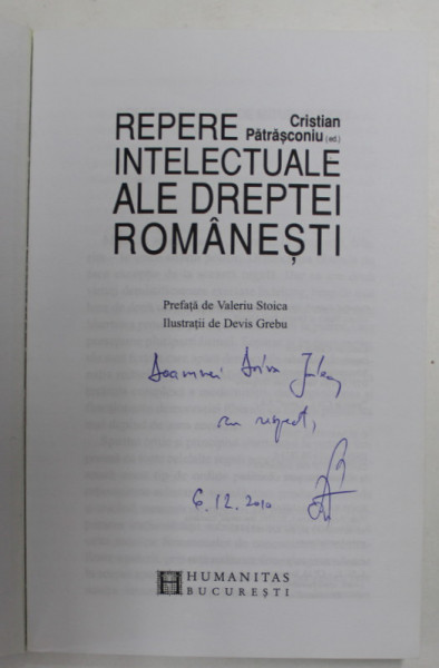 REPERE INTELECTUALE ALE DREPTEI ROMANESTI de CRISTIAN PATRASCONIU , 2010 , DEDICATIE *