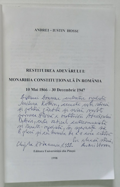 RESTITUIREA ADEVARULUI : MONARHIA CONSTITUTIONALA IN ROMANIA : 10 MAI 1866 - 30 DECEMBRIE 1947 de ANDREI - IUSTIN HOSSU , 1998 * DEDICATIE