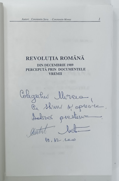 REVOLUTIA DIN DECEMBRIE 1989 PERCEPUTA PRIN DOCUMENTELE VREMII de CONSTANTIN SAVA si CONSTANTIN MONAC , 2000 , DEDICATIA AUTORILOR *